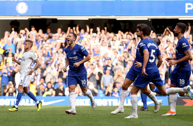 EDEN HAZARD SCORED a hat-trick as Chelsea continued their perfect start under Maurizio Sarri to move top of the Premier League with a 4-1 win over Cardiff at Stamford Bridge on Saturday.