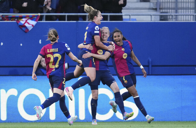 Irene Paredes (second right) celebrates with Putellas after scoring Barcelona’s third (Bagu Blanco/AP). Bagu Blanco