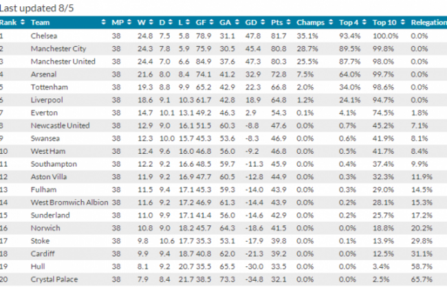 The table was compiled by Bloomberg Sport, an analytics company, who have used data from previous seasons to work out where each team will finish.