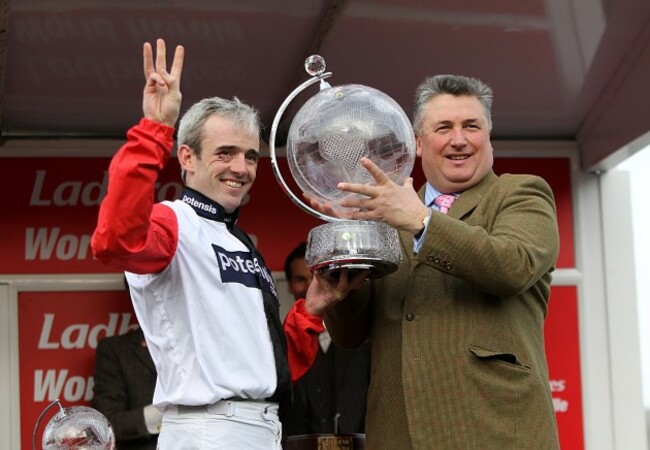 Ruby Walsh celebrates with trainer Paul Nicholls after winning a third World Hurdle on Big Buck’s last year (David Davies/PA Archive/Press Association Images)