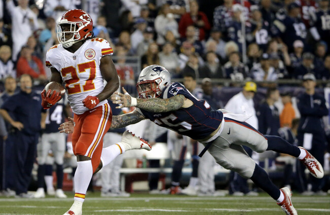 A superb 75-yard touchdown pass from Smith to Tyreek Hill then put the Chiefs 21-17 ahead only for Gillislee to barrel over from one yard to put the Patriots 24-21 ahead with 5:01 remaining in the third quarter.