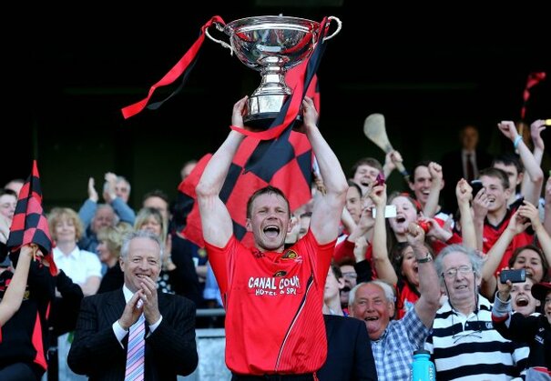 Conal Maskey lifts the Lory Meagher Cup for Warwickshire