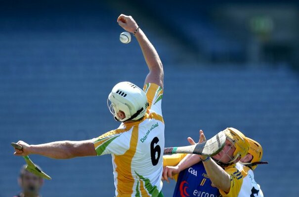 Jamsie Donnelly and Gerry Fallon compete for the sliotar