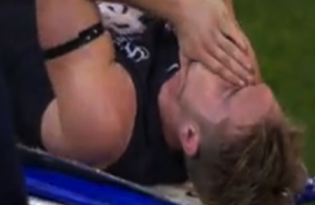 He was in pain after injuring his right knee before being tended to by Carlton medics and then stretchered off.