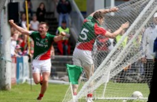 Lee Keegan hits the back of the net after scoring a goal as Cillian O'Connor celebrates setting him up. Donall Farmer/INPHO