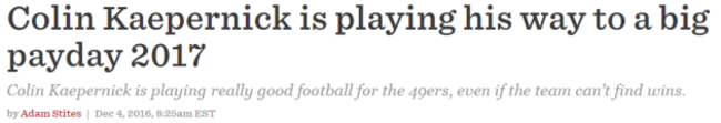 Never mind that Kaepernick has said he won’t continue his anthem protest as it has done its job by sparking a nationwide — worldwide even — conversation about social inequality.