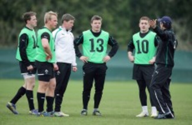 Brian O’Driscoll is left of the set-piece; both Luke Marshall and Paddy Jackson are to his right. The former captain is guiding them (with a mixed choice of language) step-by-step before even the most routine training run.