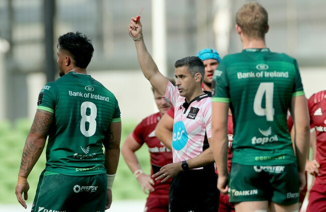 Murphy dished out five cards in the first-half of today’s match at the Aviva Stadium, two of them reds that left Connacht to play the majority of the 49-12 defeat with just 13 players.