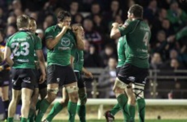 Mike McCarthy celebrates with Michael Swift after scoring a late try against Edinburgh in 2012. INPHO/Morgan Treacy
