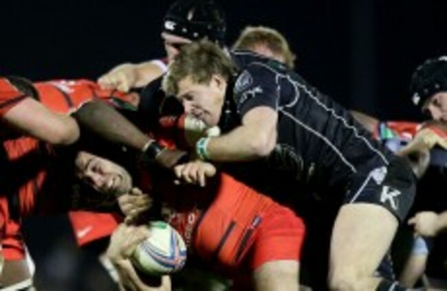 Toulouse’s Florian Fritz and Yann David tackle Dave McSharry. INPHO/James Crombie