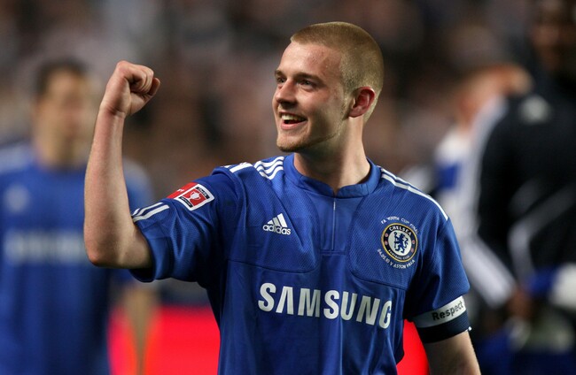 Clifford takes the ball away from Ashley Cole during a Chelsea training-session in 2010. Tom Hevezi
