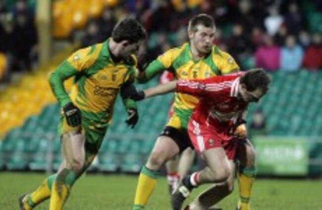 Conor McManus (middle) pictured with Donegal's Patrick McBrearty and Derry's Brian McCallion in a Dr McKenna Cup game earlier this year. INPHO/Presseye/Lorcan Doherty