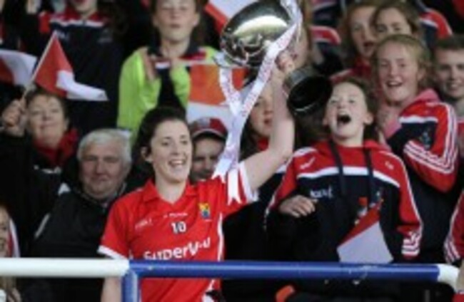 Cork captain Ciara O'Sullivan lifts the league title. Tommy Grealy/INPHO