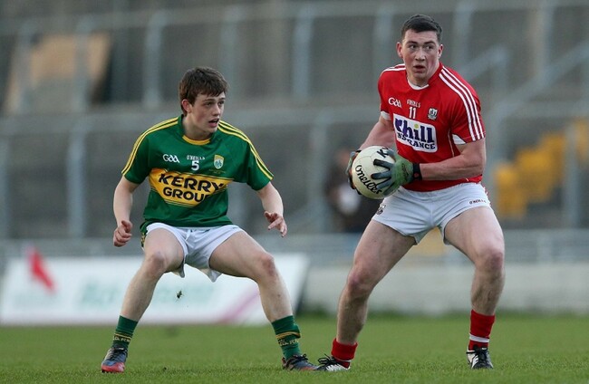 Cork's Sean O'Donoghue with Kerry's Matthew Flaherty in close attendance. Ryan Byrne/INPHO