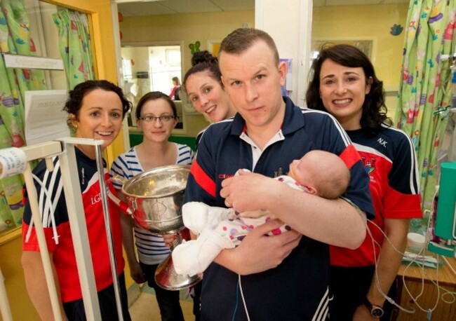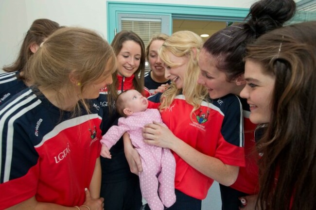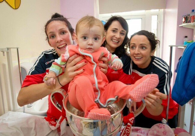 8. 11 month-old Fay Kerrigan-Bell gets to sit in the Brendan Martin Cup with Cork players Grace Kearney, Norita Kelly and Geraldine O’Flynn