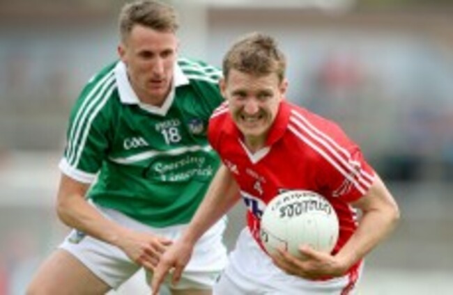 Cork's John McLoughlin up against Limerick's Michael Lyons. James Crombie/INPHO