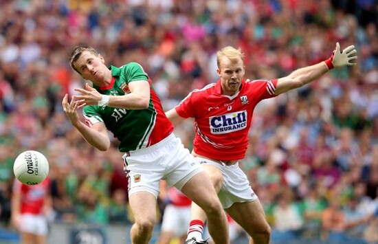 Mayo 0-9 Cork 0-8 38 mins – Andy Moran wins the ball and lays it off to Jason Doherty who points.
