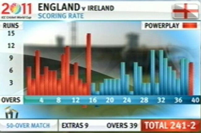 9.27 am You get the sense that England are going to punish every single mistake which the Irish fielders make. Pietersen sends a poor delivery from Johnston for a boundary, bringing up a score of 40-0 after six overs.