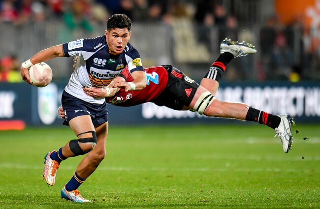 The Brumbies fluffed the restart and from the resulting scrum Richie Mo’unga went around three would-be defenders in a 30-metre run to score under the posts and Havili followed with a 40-metre intercept try.
