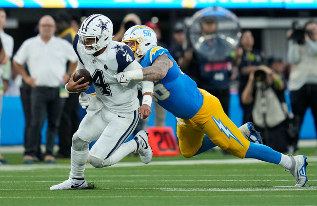 Dallas quarterback Prescott was given a torrid time by the Chargers defense, sacked five times as Los Angeles chased only their third win of the season.