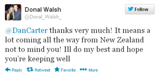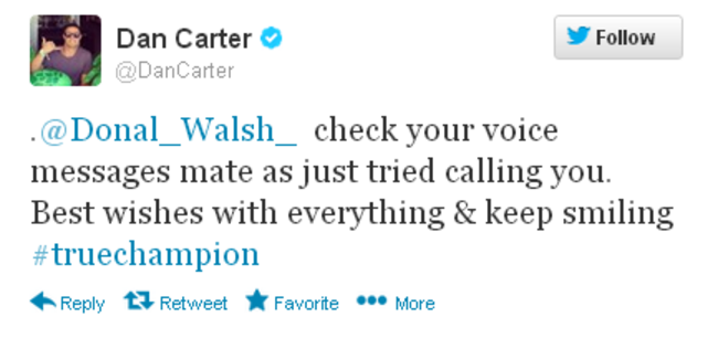 A TERMINALLY-ILL Irish teenager received an unexpected message of support this week — from All Blacks rugby star Dan Carter.