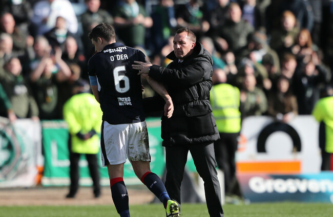O’Dea was shown a straight red card by referee Alan Muir following a last-ditch tackle on Brad Lyons, who was racing through on goal, receiving a standing ovation from the home crowd as he departed the field of play for the final time.