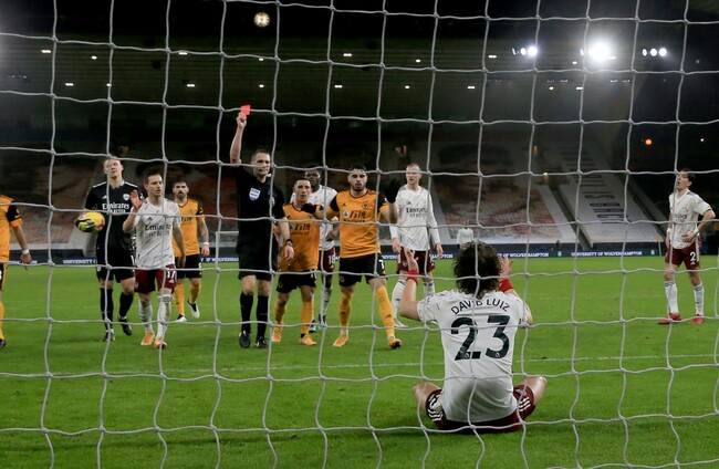 MIKEL ARTETA HIT out at the decision to send off David Luiz after nine-man Arsenal’s 2-1 defeat at Wolves.