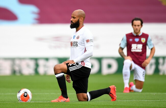Sheffield United and Ireland's David McGoldrick takes a knee in a protest against racism during a Premier League match with Burnley. Peter Powell/NMC Pool/PA Wire