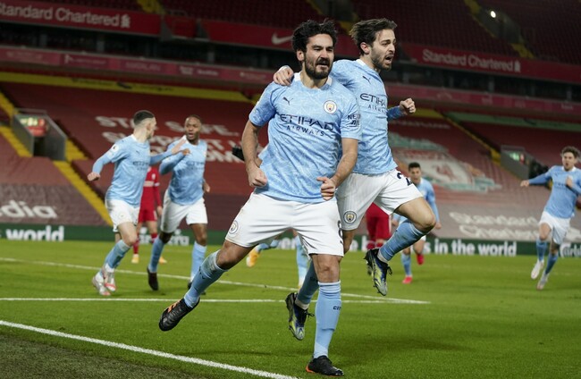 Ilkay Gundogan, celebrating a goal against Liverpool, has been key for Man City this season. Jon Super