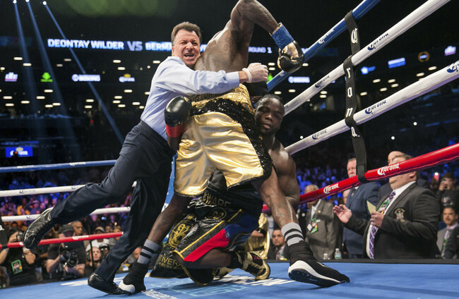 The bout’s timely ending instead birthed a potentially iconic scene, as Mercante – his annoying penchant for ‘getting involved’ at last warranted – attempted to prize Wilder off of his prey, in doing so swinging airborne from the American’s six-foot-seven frame not unlike a Dublin flag at half-mast.