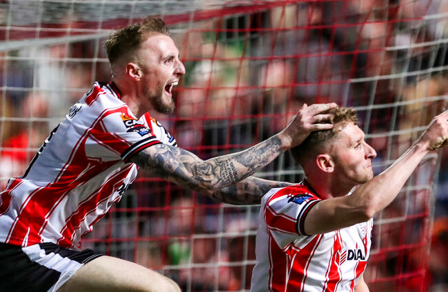 Derry's Ronan Boyce scores a goal from a bicycle kick. Lorcan Doherty / INPHO