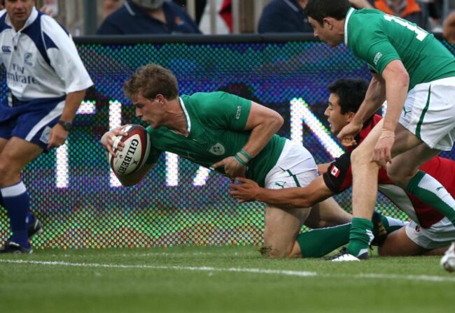 On his 50th Irish appearance, Andrew Trimble scores against Canada. (©INPHO/Billy Stickland)