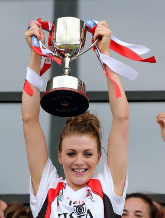 Derry captain Grainne McColdrick lifts the All-Ireland Intermediate Cup in 2012. (©INPHO/Cathal Noonan)