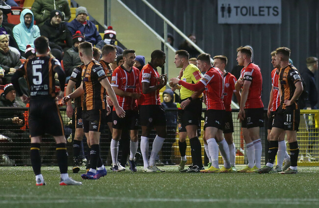 Moments later, both teams were reduced to 10 men after a flashpoint in the middle of the park. Diallo appeared to react to a robust tackle from McCourt and referee, Rob Hennessy went to his pocket and produced a straight red. Dundalk midfielder McCourt followed the Englishman down the tunnel seconds later.