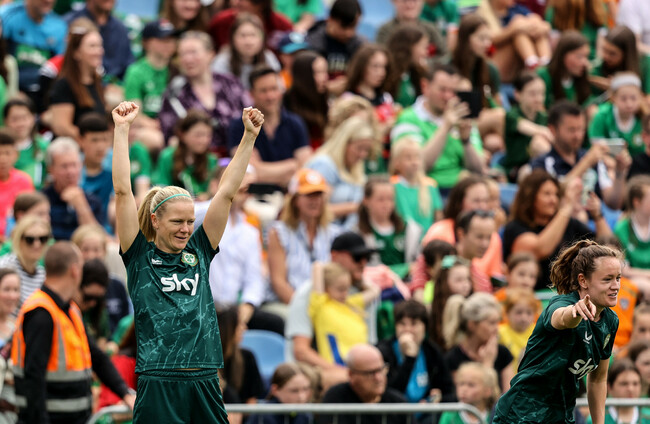 Caldwell and Louise Quinn celebrating World Cup qualification with Olivia O'Toole. Ryan Byrne / INPHO