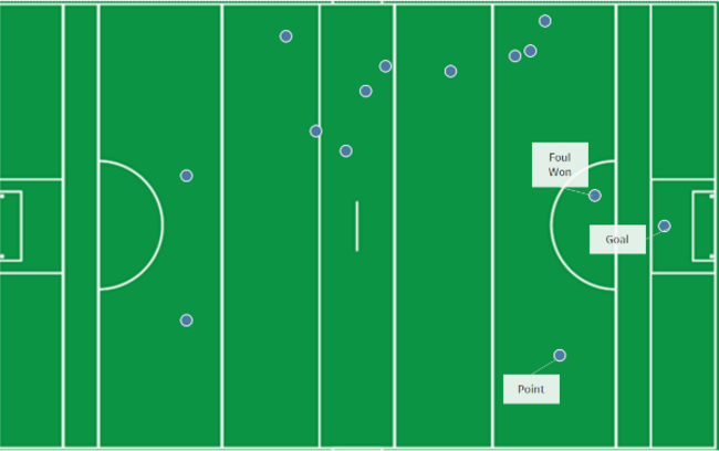 This is the touch map of his possessions from the All Ireland Replay. Again you can see a couple of times where is picking the ball up at the back but a lot of his work is done from the half-way on.