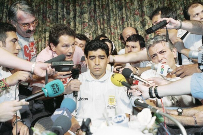 In the late evening of Thursday, 30th June, another version sat in the Sheraton Park Plaza Hotel in Dallas, Texas. Surrounded by the world’s media, Maradona cut a sombre figure. He spoke quietly and took dramatic pauses between answers. His brow furrowed, his head bowed, he seemed tired. It had been a long day. He didn’t raise his voice.