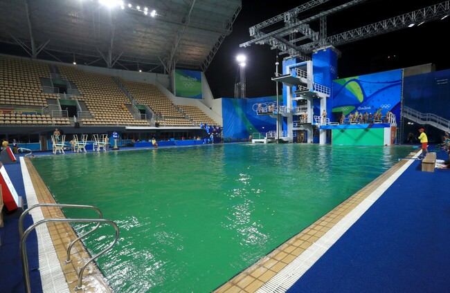 OFFICIALS AT THE Rio Games diving competition were scratching their heads this evening over the colour of the pool water, which had turned an odd green colour overnight.