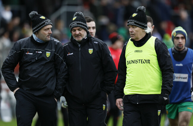 Donegal selector Paddy Bradley, head coach Aidan O'Rourke, and manager Paddy Carr at a Dr McKenna Cup game in January. Philip Magowan/INPHO