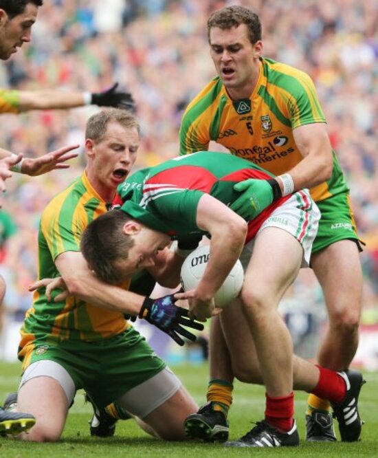 Yellow card for Mayo’s Aidan O’Shea after a big hit on Donegal’s Frank McGlynn.