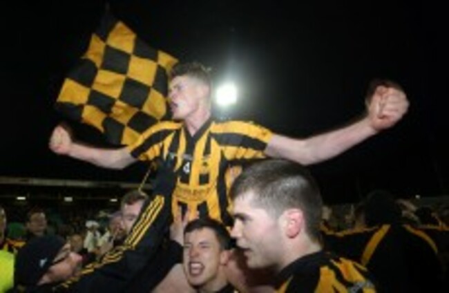 Rory Kavanagh, the club captain, accepted the trophy on behalf of Maxi Curran’s team in the Ballybofey rain after their 0-9 to 0-6 victory over neighbours Glenswilly this evening before dragging well-known club stalwart Brian Kelly forward for the rendition.