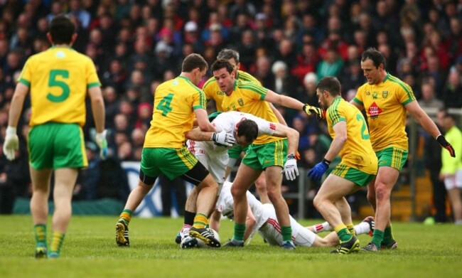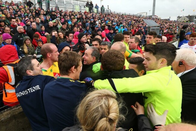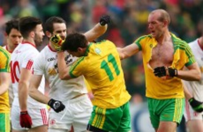 Both teams finished the game with 14 men as Neil Gallagher and Sean Cavanagh were both dismissed in the closing stages, while there was also a flashpoint at half-time with several players and mentors involved as the teams left MacCumhaill Park.