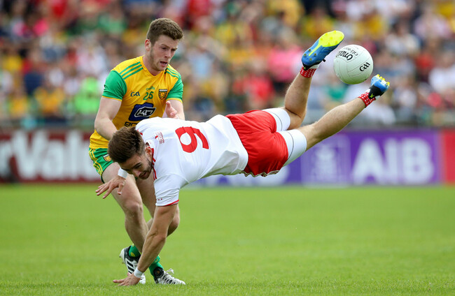 19 mins — Tyrone 0-4 Donegal 0-2: Mattie Donnelly shows great strength to power through a few Donegal tackles and kicks a point off his left that glances off the far post before dropping over.