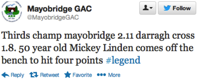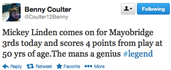 Linden came off the bench today for his club Mayobridge in the thirds local championship in Down and showed he still has an eye for a score by registering 0-4 from play.