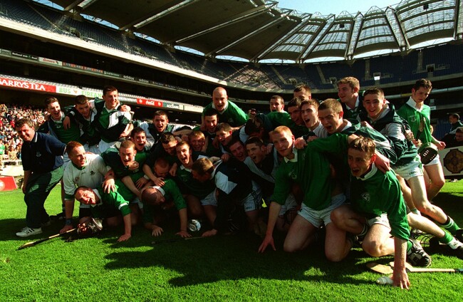 The St Colman's team celebrating their 2001 Croke Cup final win. Lorraine O'Sullivan / INPHO
