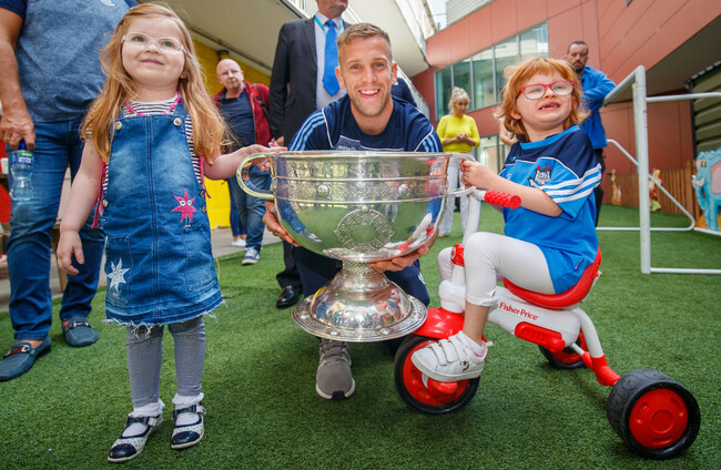 FOLLOWING THEIR four-in-a-row All-Ireland success, the Dublin footballers continued their celebrations by bringing the Sam Maguire trophy to the children’s hospitals in the capital on Monday.