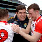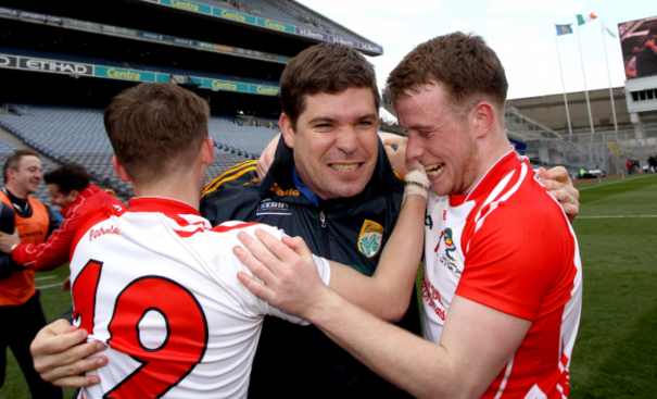 Eamonn Fitzmaurice celebrates with his PS Chorca Dhuibhne players.