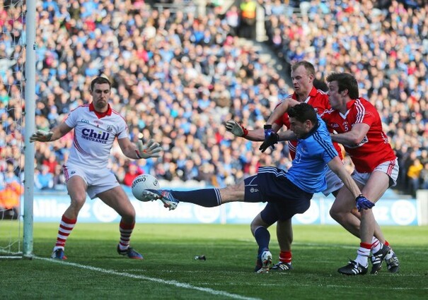 Michael Shields and James Loughrey tackle Bernard Brogan
