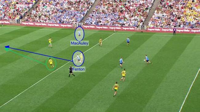 McHugh is slowed again by Fenton and eventually lays the pass backwards. Already Dublin have the men back. MacAuley who was full forward a few seconds previously is just arriving in support of his defence. It’s a phenomenal effort for Dublin.