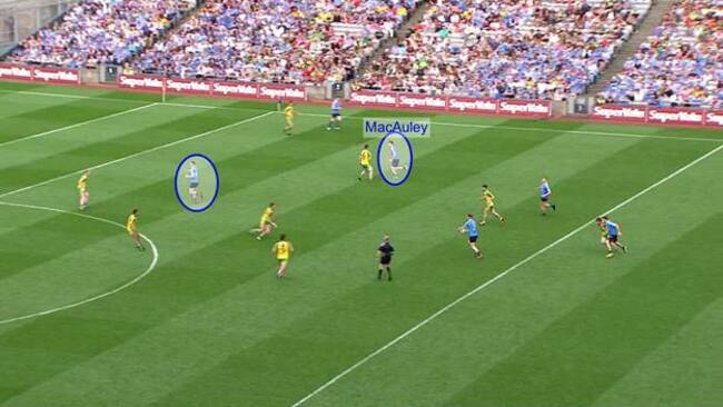 They also have a player hugging the near touchline. Brian Fenton lays the ball off. As the move progresses, MacAuley jogs towards the far wing. He never once looks around to see where the ball is, he is simply trying to drag is player out of the way.
